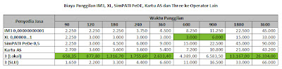 Jangan lupa untuk menambahkan PPn 10%, sehingga tarifnya menjadi Rp. 877,8 untuk lokal dan Rp. 2.200 untuk SLJJ - Pemakaian 180 detik (3 menit)Ini adalah waktu “ideal” yang sering disebutkan pada berbagai iklan. Biaya yang dikeluarkan untuk skenario ini adalah 399 x 3 = Rp. 1.197 + 119,7 = Rp. 1.316,7 untuk panggilan lokal ke lain operator dan 1.000 x 3 = Rp. 3.000 + 300 = Rp. 3.300 untuk panggilan SLJJ ke lain operator.
