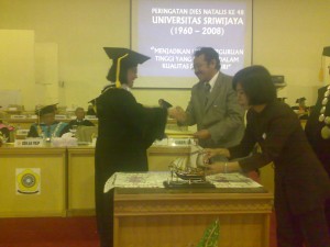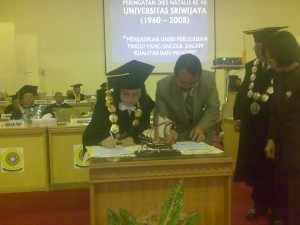 Setelah tiba, langsung menuju ruang tunggu yang dipenuhi oleh Pembantu Rektor, Dekan dan Ketua Jurusan berpakaian toga lengkap. Rupanya ini adalah acara Dies Natalis Universitas Sriwijaya. Jadilah saya kembali menjadi orang paling aneh sendiri. Lha pakaian adalah Batik lengan panjang, sedangkan yang lain pada menggunakan toga lengkap, yang tidak menggunakan toga malah memakai Jas Lengkap, tapi cuek aja deh…